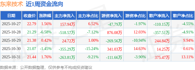 资金流向数据方面,本周东来技术主力资金合计净流出955.01万元,游资资金合计净流入788.1万元,散户资金合计净流入166.91万元。本周资金流向一览见下表:
