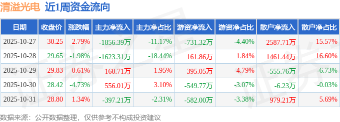 资金流向数据方面,本周清溢光电主力资金合计净流出3160.19万元,游资资金合计净流出1306.19万元,散户资金合计净流入4466.38万元。本周资金流向一览见下表: