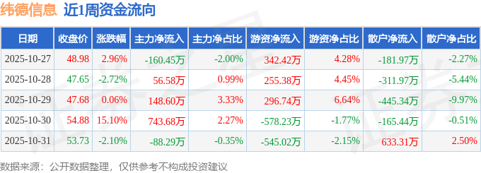 资金流向数据方面,本周纬德信息主力资金合计净流入700.12万元,游资资金合计净流出228.71万元,散户资金合计净流出471.41万元。本周资金流向一览见下表: