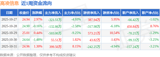 资金流向数据方面,本周高凌信息主力资金合计净流出502.37万元,游资资金合计净流入444.74万元,散户资金合计净流入57.63万元。本周资金流向一览见下表: