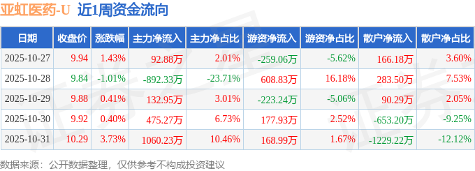 资金流向数据方面,本周亚虹医药主力资金合计净流入869.0万元,游资资金合计净流入473.45万元,散户资金合计净流出1342.45万元。本周资金流向一览见下表: