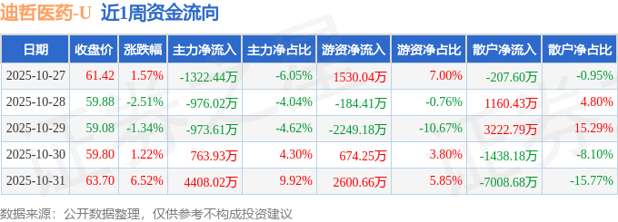 资金流向数据方面,本周迪哲医药主力资金合计净流入1899.88万元,游资资金合计净流入2371.36万元,散户资金合计净流出4271.24万元。本周资金流向一览见下表:
