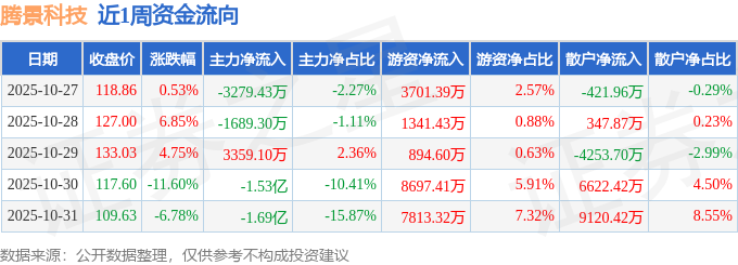 资金流向数据方面,本周腾景科技主力资金合计净流出3.39亿元,游资资金合计净流入2.24亿元,散户资金合计净流入1.14亿元。本周资金流向一览见下表: