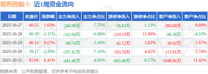资金流向数据方面,本周首药控股主力资金合计净流出1233.19万元,游资资金合计净流出154.62万元,散户资金合计净流入1387.81万元。本周资金流向一览见下表: