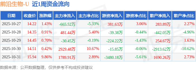 资金流向数据方面,本周前沿生物主力资金合计净流入4504.86万元,游资资金合计净流出3378.01万元,散户资金合计净流出1126.85万元。本周资金流向一览见下表: