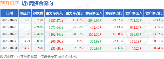 资金流向数据方面,本周盟升电子主力资金合计净流入1619.76万元,游资资金合计净流出1413.27万元,散户资金合计净流出206.5万元。本周资金流向一览见下表: