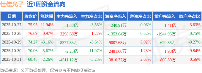 资金流向数据方面,本周仕佳光子主力资金合计净流出4.58亿元,游资资金合计净流入1.37亿元,散户资金合计净流入3.21亿元。本周资金流向一览见下表: