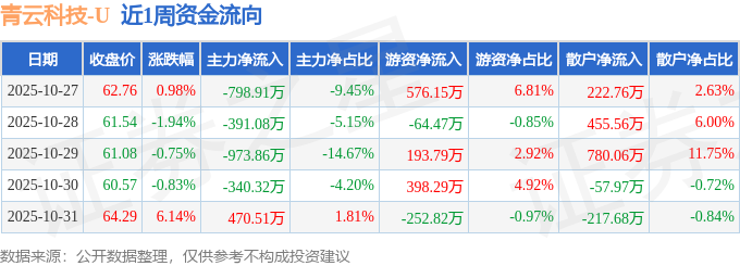 资金流向数据方面,本周青云科技主力资金合计净流出2033.65万元,游资资金合计净流入850.93万元,散户资金合计净流入1182.72万元。本周资金流向一览见下表: