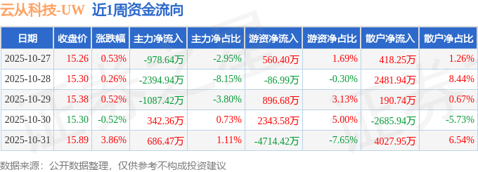 资金流向数据方面,本周云从科技主力资金合计净流出3432.17万元,游资资金合计净流出1000.76万元,散户资金合计净流入4432.93万元。本周资金流向一览见下表: