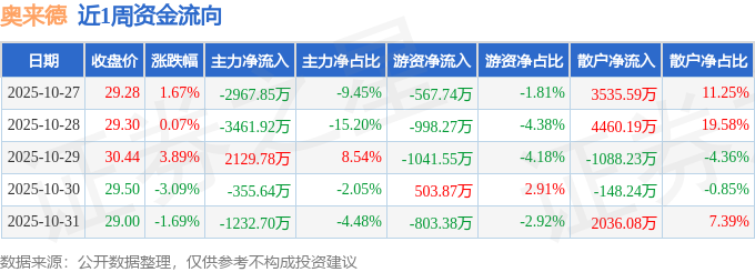 资金流向数据方面,本周奥来德主力资金合计净流出5888.32万元,游资资金合计净流出2907.07万元,散户资金合计净流入8795.39万元。本周资金流向一览见下表: