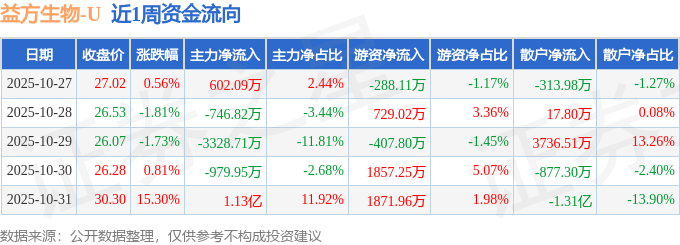 资金流向数据方面,本周益方生物主力资金合计净流入6801.46万元,游资资金合计净流入3762.32万元,散户资金合计净流出1.06亿元。本周资金流向一览见下表: