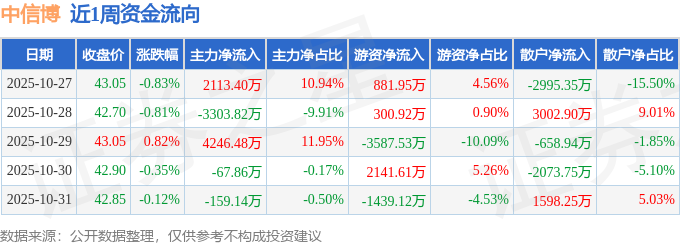 资金流向数据方面,本周中信博主力资金合计净流入2829.06万元,游资资金合计净流出1702.17万元,散户资金合计净流出1126.89万元。本周资金流向一览见下表: