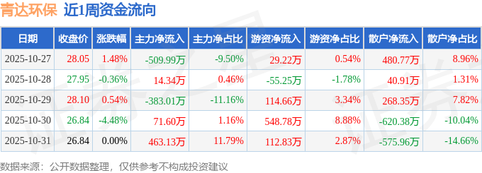 资金流向数据方面,本周青达环保主力资金合计净流出343.92万元,游资资金合计净流入750.23万元,散户资金合计净流出406.31万元。本周资金流向一览见下表: