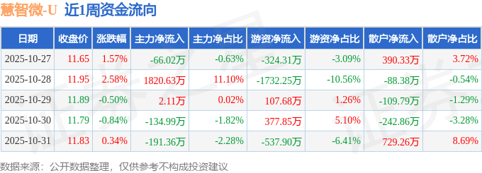 资金流向数据方面,本周慧智微主力资金合计净流入1430.36万元,游资资金合计净流出2108.93万元,散户资金合计净流入678.56万元。本周资金流向一览见下表: