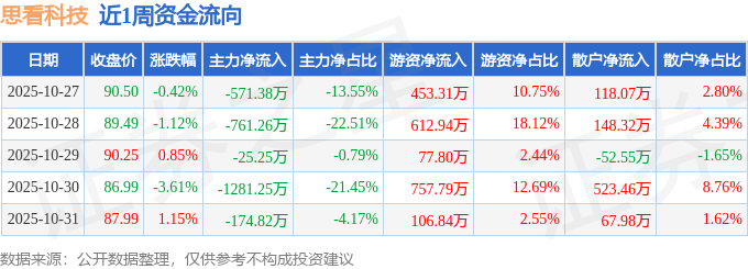 资金流向数据方面,本周思看科技主力资金合计净流出2813.96万元,游资资金合计净流入2008.67万元,散户资金合计净流入805.28万元。本周资金流向一览见下表: