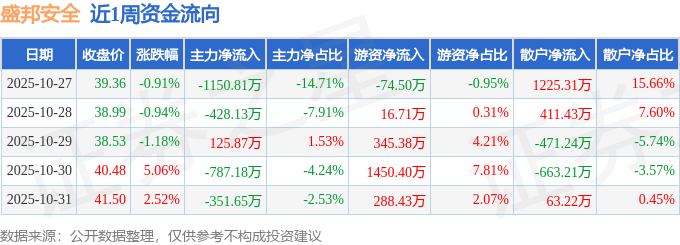 资金流向数据方面,本周盛邦安全主力资金合计净流出2591.91万元,游资资金合计净流入2026.42万元,散户资金合计净流入565.5万元。本周资金流向一览见下表: