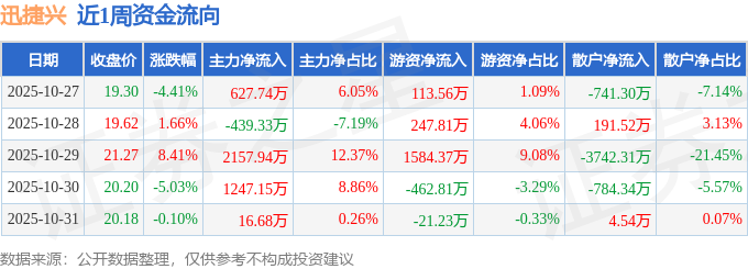 资金流向数据方面,本周迅捷兴主力资金合计净流入3610.18万元,游资资金合计净流入1461.7万元,散户资金合计净流出5071.89万元。本周资金流向一览见下表: