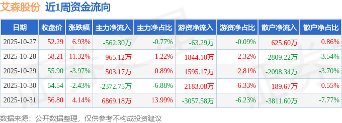 资金流向数据方面,本周艾森股份主力资金合计净流入5402.41万元,游资资金合计净流入2501.48万元,散户资金合计净流出7903.89万元。本周资金流向一览见下表: