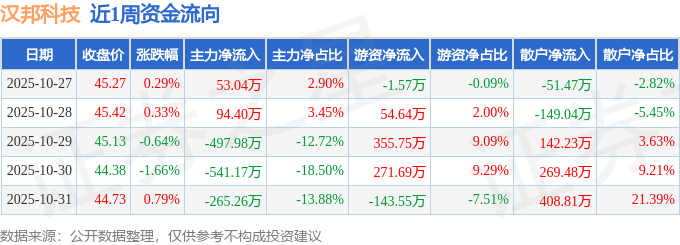 资金流向数据方面,本周汉邦科技主力资金合计净流出1156.96万元,游资资金合计净流入536.95万元,散户资金合计净流入620.01万元。本周资金流向一览见下表: