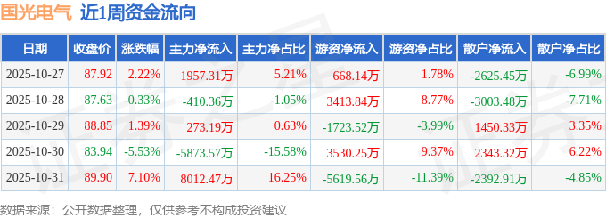 资金流向数据方面,本周国光电气主力资金合计净流入3959.04万元,游资资金合计净流入269.13万元,散户资金合计净流出4228.17万元。本周资金流向一览见下表: