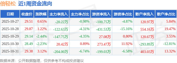 资金流向数据方面,本周倍轻松主力资金合计净流出474.18万元,游资资金合计净流出430.76万元,散户资金合计净流入904.95万元。本周资金流向一览见下表: