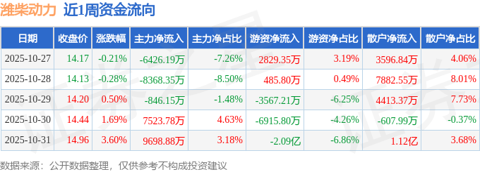 资金流向数据方面,本周潍柴动力主力资金合计净流入1581.98万元,游资资金合计净流出2.81亿元,散户资金合计净流入2.65亿元。本周资金流向一览见下表: