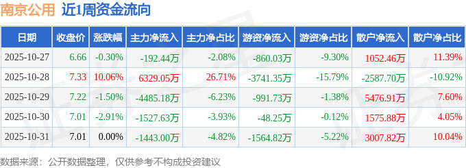 资金流向数据方面,本周南京公用主力资金合计净流出1319.19万元,游资资金合计净流出7206.18万元,散户资金合计净流入8525.37万元。本周资金流向一览见下表: