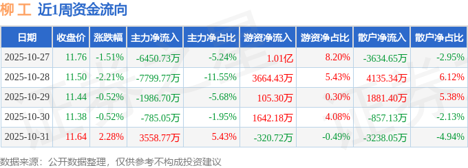 资金流向数据方面,本周柳 工主力资金合计净流出1.35亿元,游资资金合计净流入1.52亿元,散户资金合计净流出1713.08万元。本周资金流向一览见下表: