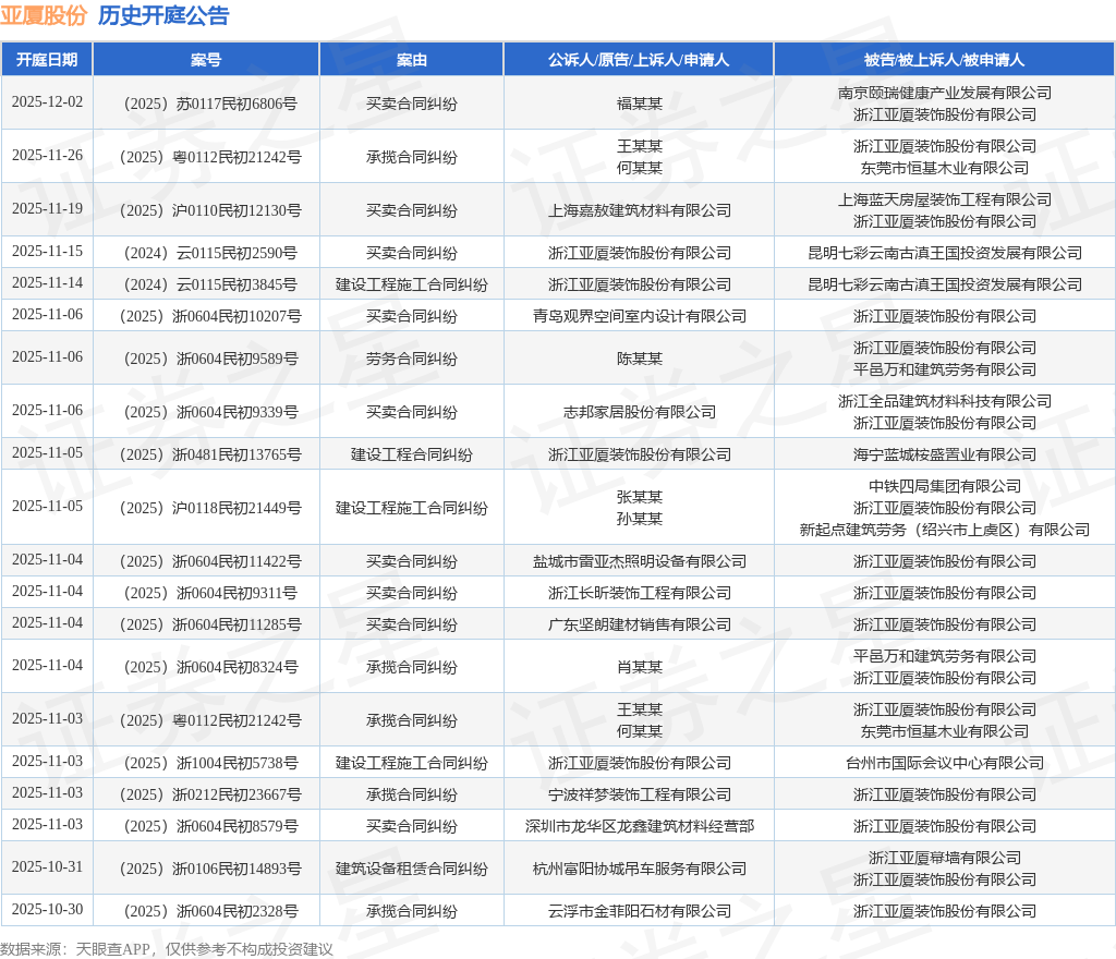 案号:(2025)浙0604民初8324号根据统计,近一年内以浙江亚厦装饰股份有限公司为当事人的历史开庭公告有571则,其中案由为“买卖合同纠纷”的公告以194则居首,其次为“劳务合同纠纷”有103则,“建设工程施工合同纠纷”有65则。历史开庭公告(前20条)如下:
