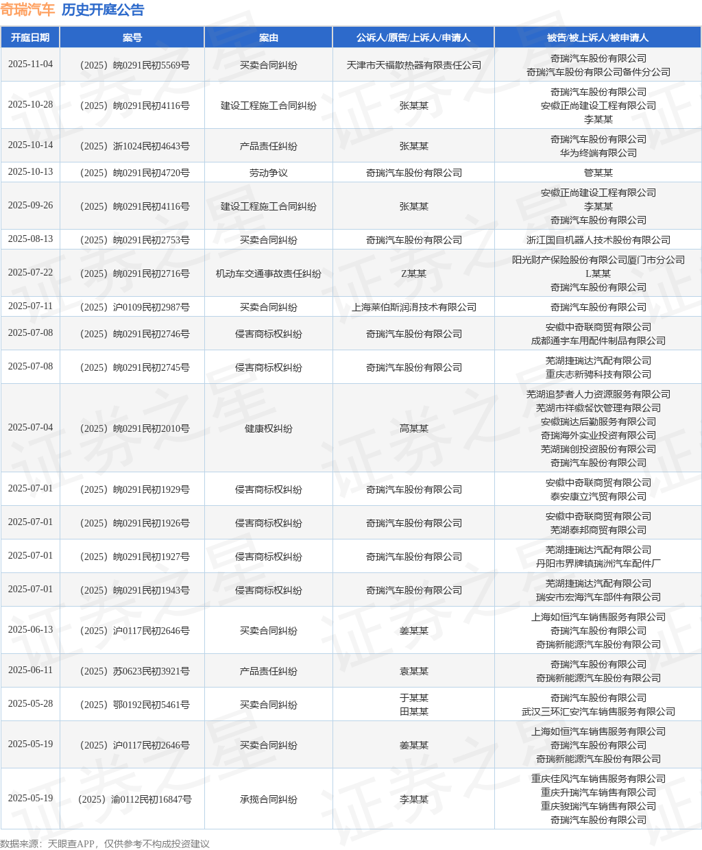 案号:(2025)皖0291民初5569号根据统计,近一年内以奇瑞汽车股份有限公司为当事人的历史开庭公告有35则,其中案由为“侵害商标权纠纷”的公告以11则居首,其次为“买卖合同纠纷”有7则,“产品责任纠纷”有3则。历史开庭公告(前20条)如下: