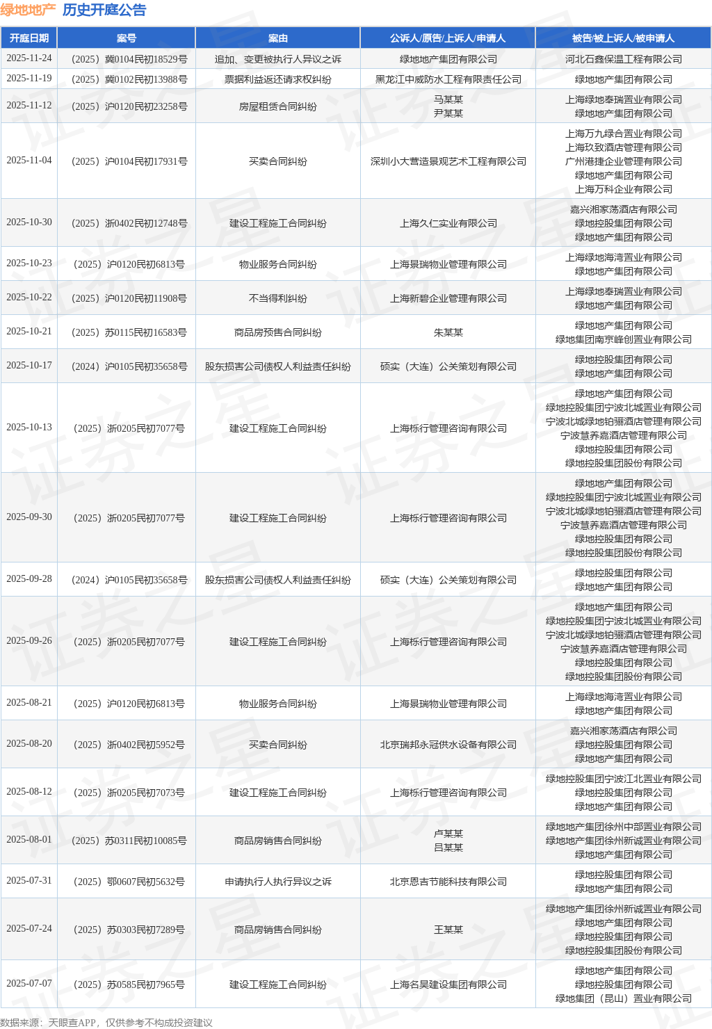 案号:(2025)沪0104民初17931号根据统计,近一年内以绿地地产集团有限公司为当事人的历史开庭公告有99则,其中案由为“建设工程施工合同纠纷”的公告以18则居首,其次为“建设工程合同纠纷”有16则,“金融借款合同纠纷”有13则。历史开庭公告(前20条)如下: