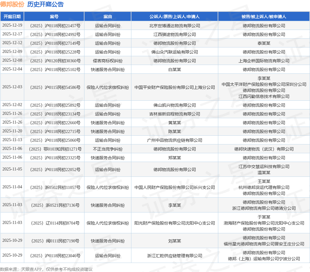 案号:(2025)浙0502民初11057号根据统计,近一年内以德邦物流股份有限公司为当事人的历史开庭公告有386则,其中案由为“快递服务合同纠纷”的公告以124则居首,其次为“运输合同纠纷”有76则,“劳动争议”有27则。历史开庭公告(前20条)如下: