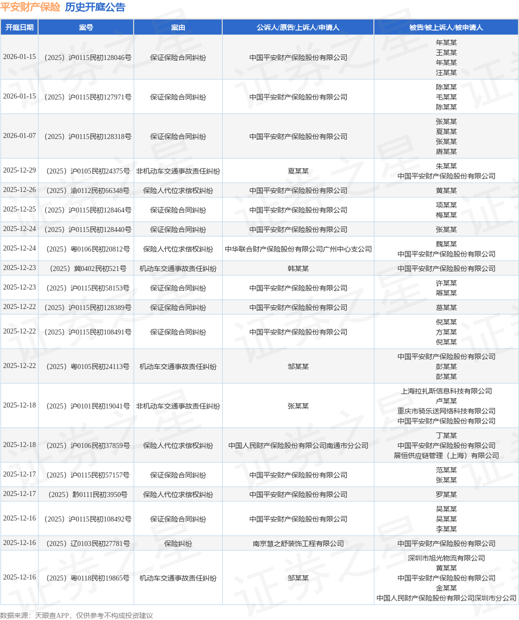 案号:(2025)沪0106民初40034号根据统计,近一年内以中国平安财产保险股份有限公司为当事人的历史开庭公告有2380则,其中案由为“机动车交通事故责任纠纷”的公告以1139则居首,其次为“保证保险合同纠纷”有297则,“保险人代位求偿权纠纷”有182则。历史开庭公告(前20条)如下: