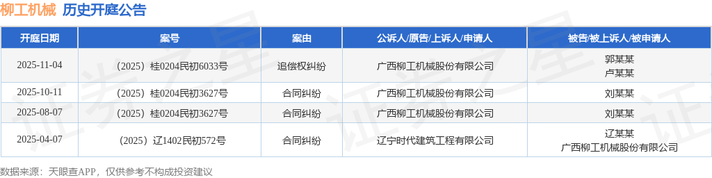根据统计,近一年内以广西柳工机械股份有限公司为当事人的历史开庭公告有4则,其中案由为“合同纠纷”的公告以3则居首,其次为“追偿权纠纷”有1则。历史开庭公告如下: