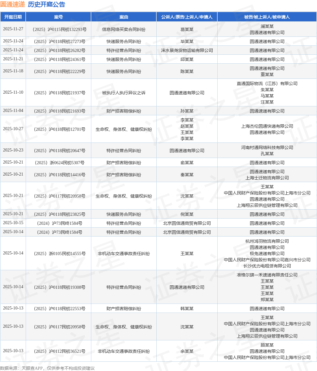 案号:(2025)沪0118民初21693号根据统计,近一年内以圆通速递有限公司为当事人的历史开庭公告有153则,其中案由为“快递服务合同纠纷”的公告以35则居首,其次为“特许经营合同纠纷”有24则,“机动车交通事故责任纠纷”有13则。历史开庭公告(前20条)如下: