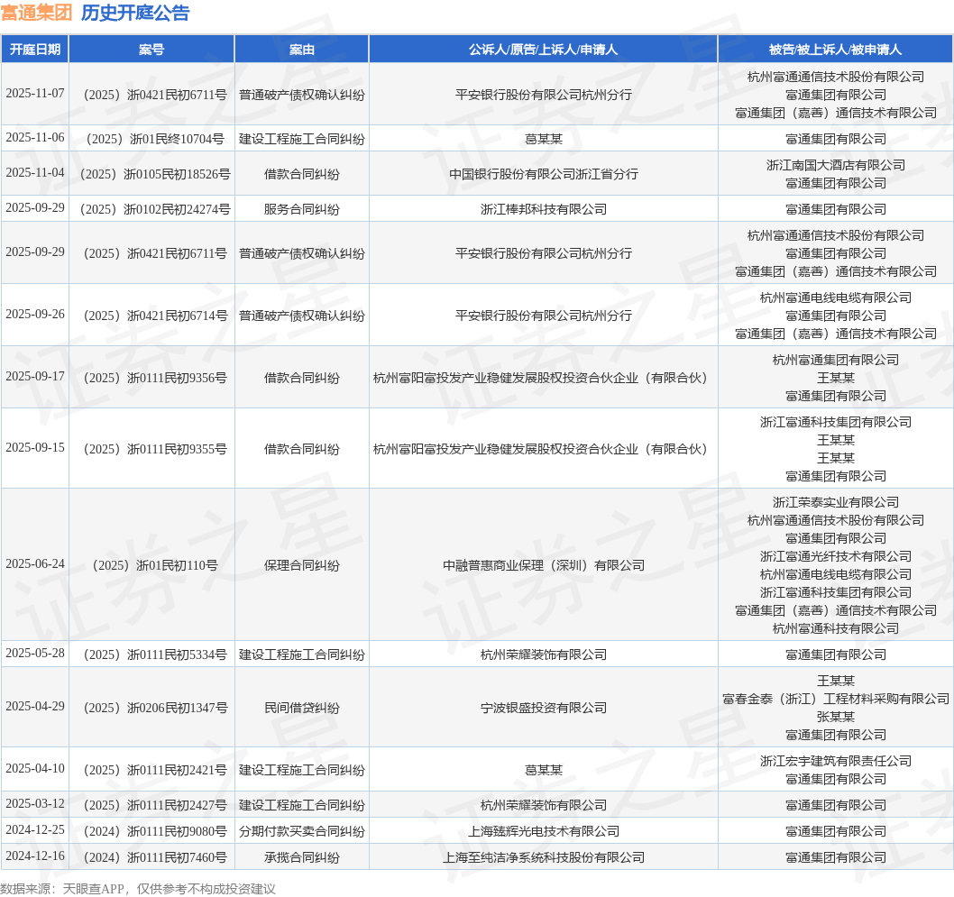 案号:(2025)浙0105民初18526号根据统计,近一年内以富通集团有限公司为当事人的历史开庭公告有15则,其中案由为“建设工程施工合同纠纷”的公告以4则居首,其次为“借款合同纠纷”有3则,“普通破产债权确认纠纷”有3则。历史开庭公告如下: