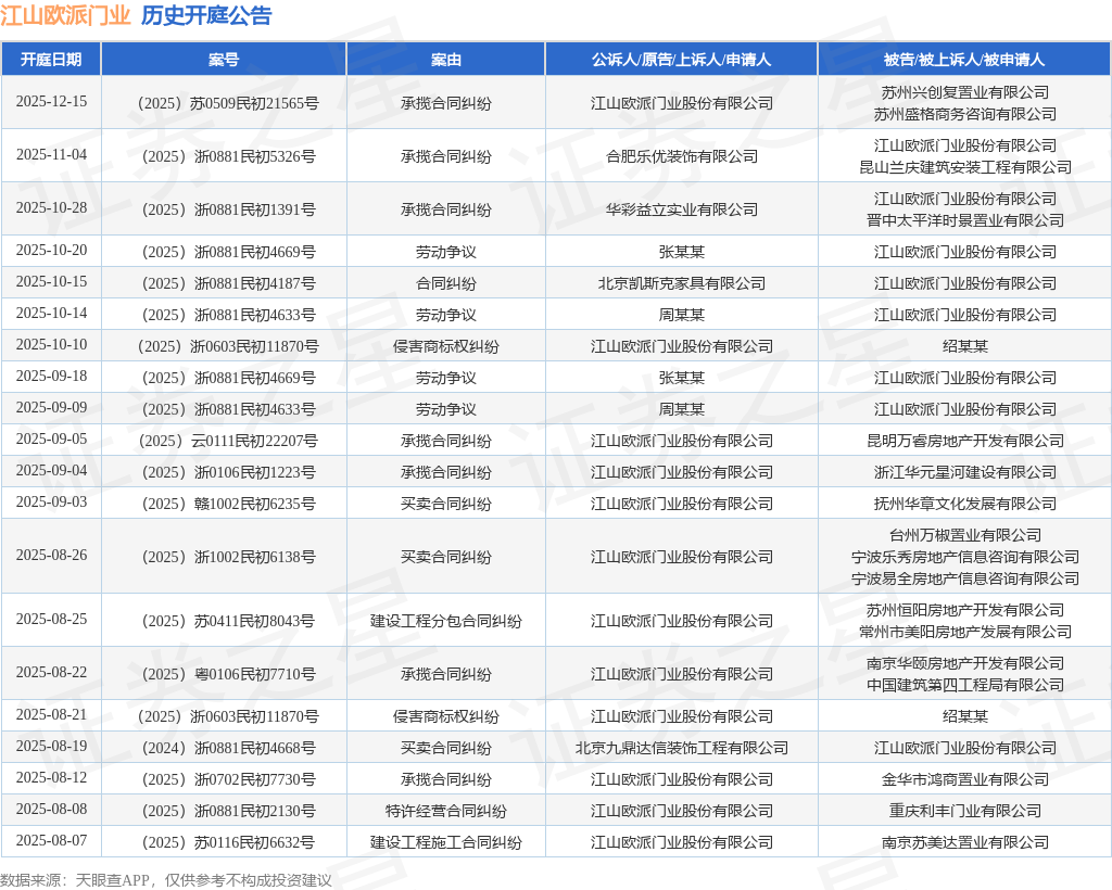 案号:(2025)浙0881民初5326号根据统计,近一年内以江山欧派门业股份有限公司为当事人的历史开庭公告有99则,其中案由为“承揽合同纠纷”的公告以34则居首,其次为“买卖合同纠纷”有19则,“劳动争议”有10则。历史开庭公告(前20条)如下: