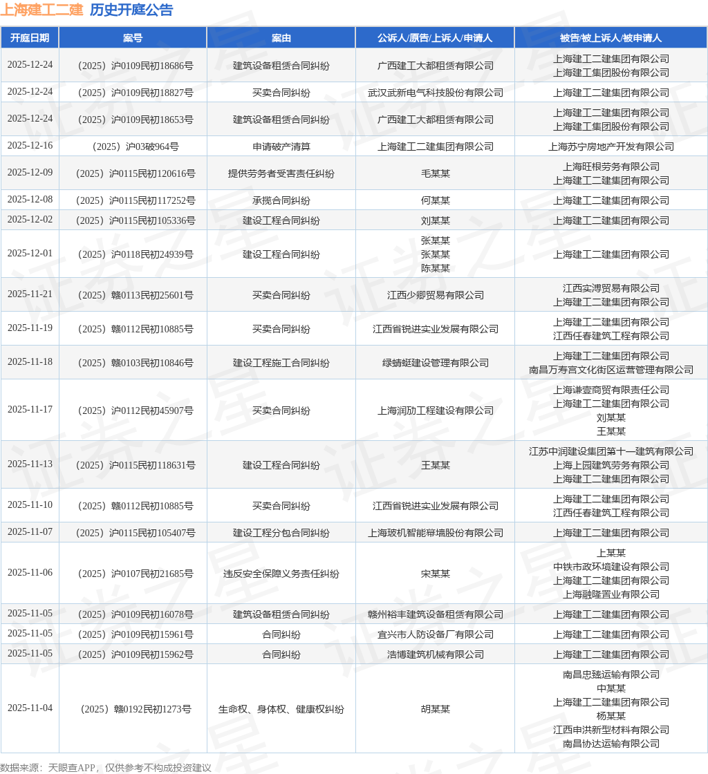 案号:(2025)赣0192民初1273号根据统计,近一年内以上海建工二建集团有限公司为当事人的历史开庭公告有273则,其中案由为“建设工程施工合同纠纷”的公告以70则居首,其次为“买卖合同纠纷”有31则,“建设工程分包合同纠纷”有29则。历史开庭公告(前20条)如下: