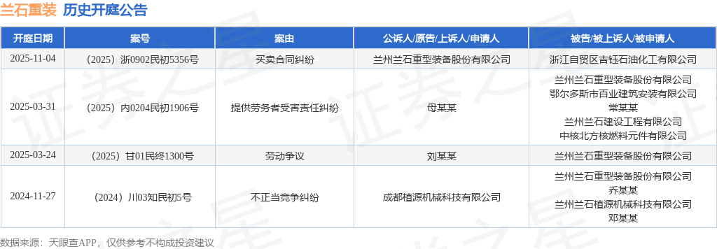 案号:(2025)浙0902民初5356号根据统计,近一年内以兰州兰石重型装备股份有限公司为当事人的历史开庭公告有4则,其中案由为“不正当竞争纠纷”的公告以1则居首,其次为“买卖合同纠纷”有1则,“劳动争议”有1则。历史开庭公告如下: