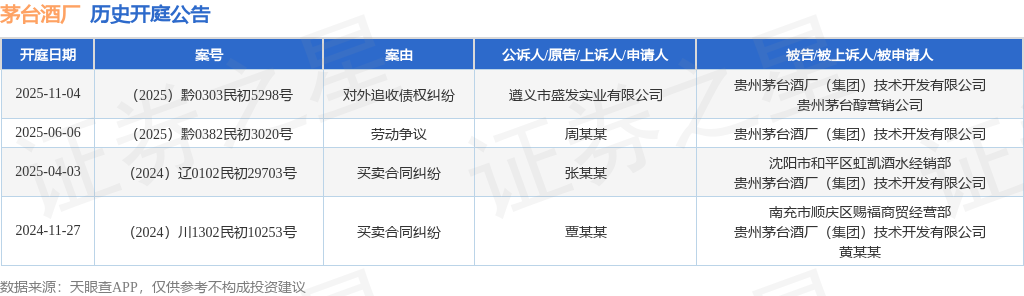 案号:(2025)黔0303民初5298号根据统计,近一年内以贵州茅台酒厂(集团)技术开发有限公司为当事人的历史开庭公告有4则,其中案由为“买卖合同纠纷”的公告以2则居首,其次为“劳动争议”有1则,“对外追收债权纠纷”有1则。历史开庭公告如下: