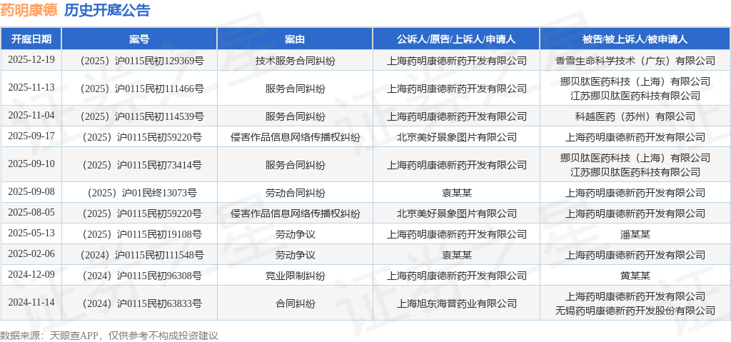 案号:(2025)沪0115民初114539号根据统计,近一年内以上海药明康德新药开发有限公司为当事人的历史开庭公告有11则,其中案由为“服务合同纠纷”的公告以3则居首,其次为“侵害作品信息网络传播权纠纷”有2则,“劳动争议”有2则。历史开庭公告如下: