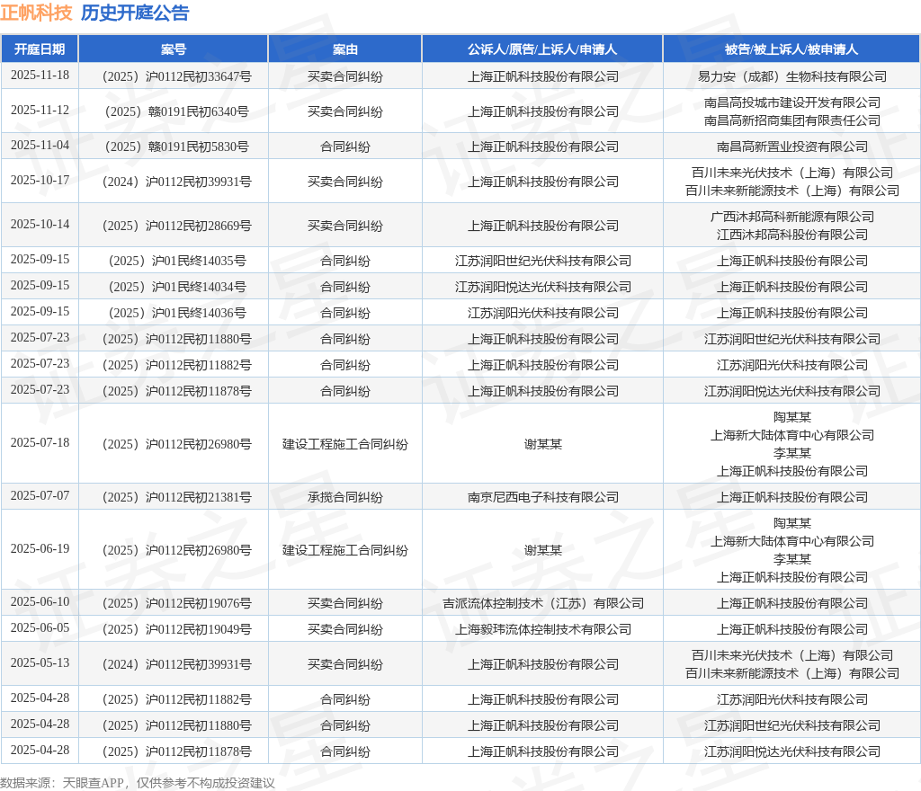 案号:(2025)赣0191民初5830号根据统计,近一年内以上海正帆科技股份有限公司为当事人的历史开庭公告有42则,其中案由为“买卖合同纠纷”的公告以17则居首,其次为“合同纠纷”有10则,“承揽合同纠纷”有9则。历史开庭公告(前20条)如下: