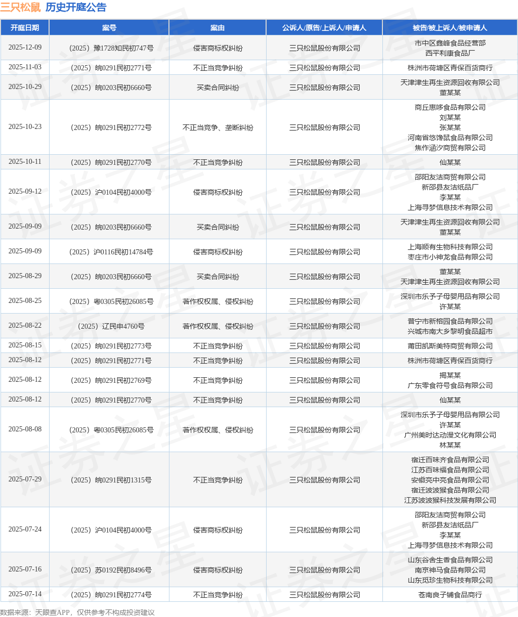 案号:(2025)皖0291民初2771号根据统计,近一年内以三只松鼠股份有限公司为当事人的历史开庭公告有64则,其中案由为“不正当竞争纠纷”的公告以28则居首,其次为“著作权权属、侵权纠纷”有10则,“侵害商标权纠纷”有8则。历史开庭公告(前20条)如下: