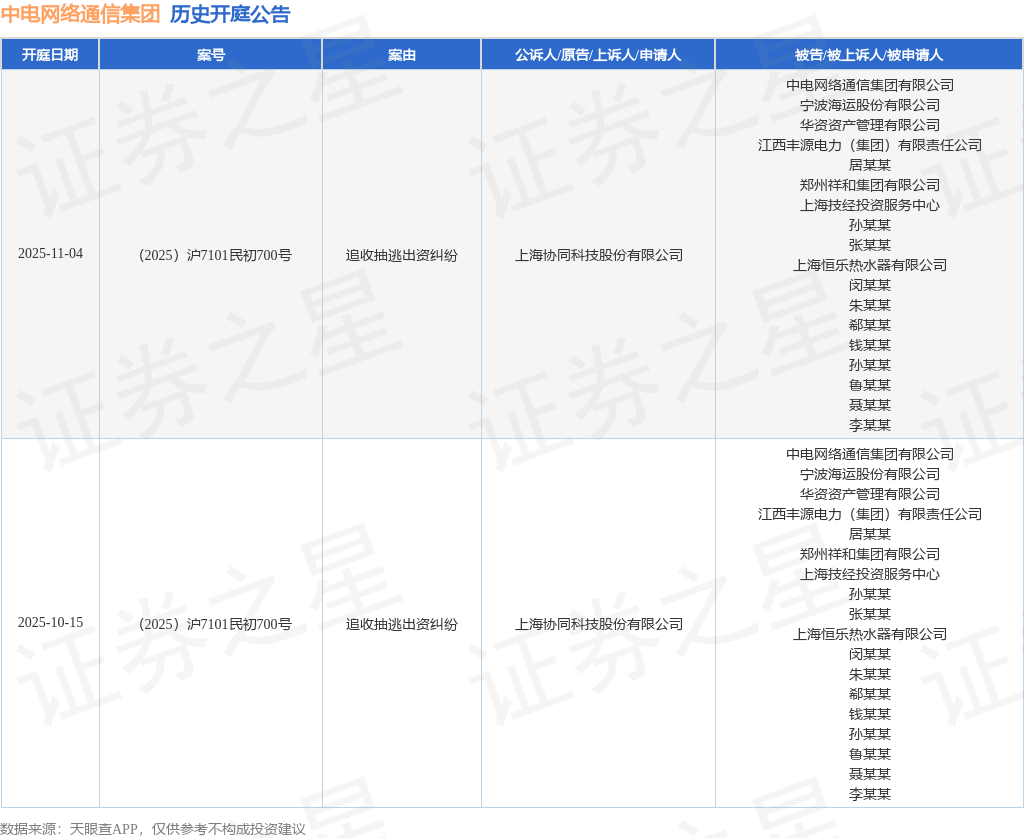 根据统计,近一年内以中电网络通信集团有限公司为当事人的历史开庭公告有2则,其中案由为“追收抽逃出资纠纷”的公告以2则居首。历史开庭公告如下: