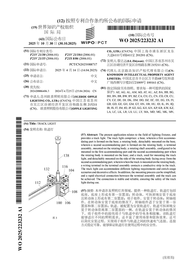 证券之星消息,根据企查查数据显示欧普照明(603515)公布了一项国际专利申请,专利名为“轨道灯”,专利申请号为PCT/CN2025/088717,国际公布日为2025年10月30日。