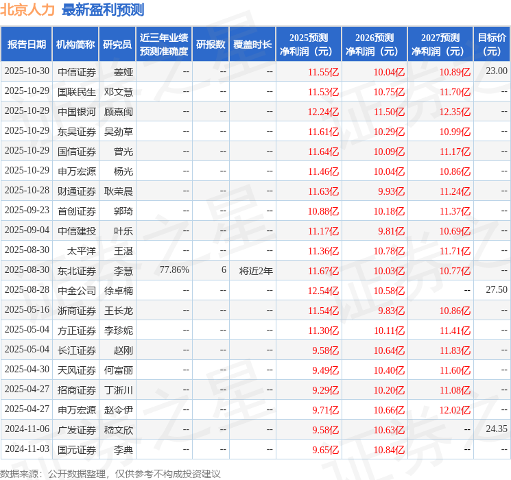 太平洋证券股份有限公司王湛近期对北京人力进行研究并发布了研究报告《25Q3点评:费用端持续优化,盈利能力显韧性》,给予北京人力买入评级。