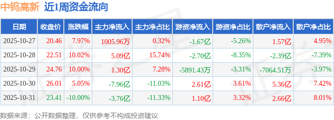 资金流向数据方面,本周中钨高新主力资金合计净流出5.24亿元,游资资金合计净流出1.25亿元,散户资金合计净流入6.5亿元。本周资金流向一览见下表: