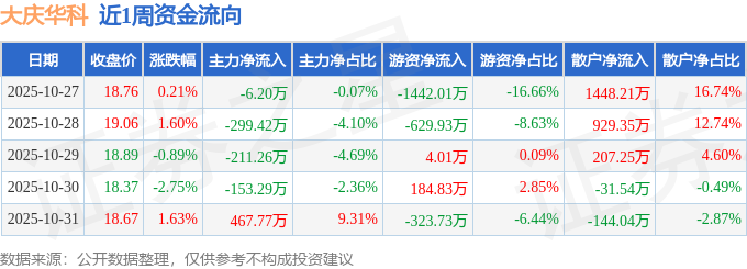 资金流向数据方面,本周大庆华科主力资金合计净流出202.4万元,游资资金合计净流出2206.84万元,散户资金合计净流入2409.23万元。本周资金流向一览见下表: