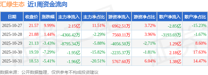 资金流向数据方面,本周汇绿生态主力资金合计净流出3.08亿元,游资资金合计净流入1.4亿元,散户资金合计净流入1.68亿元。本周资金流向一览见下表: