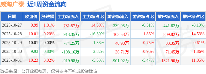 资金流向数据方面,本周威海广泰主力资金合计净流出1234.17万元,游资资金合计净流出1060.73万元,散户资金合计净流入2294.9万元。本周资金流向一览见下表: